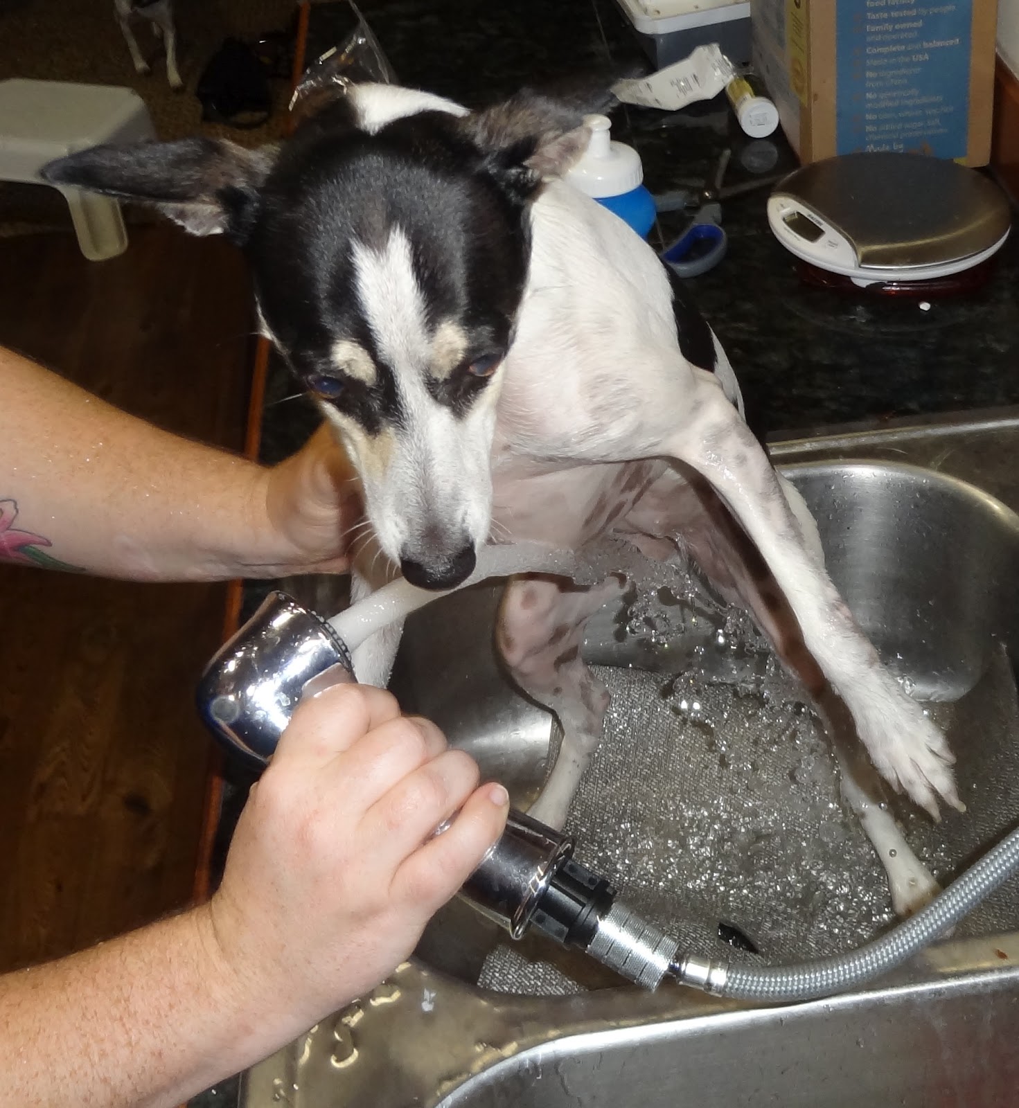 The first order of business was a bath. Rat terriers are very clean dogs, and rarely need baths. I wanted Lucia to be squeaky clean for Maggie though, so into the sink we went! Lucia did not approve of this nonsense, but she stuck it out with me!